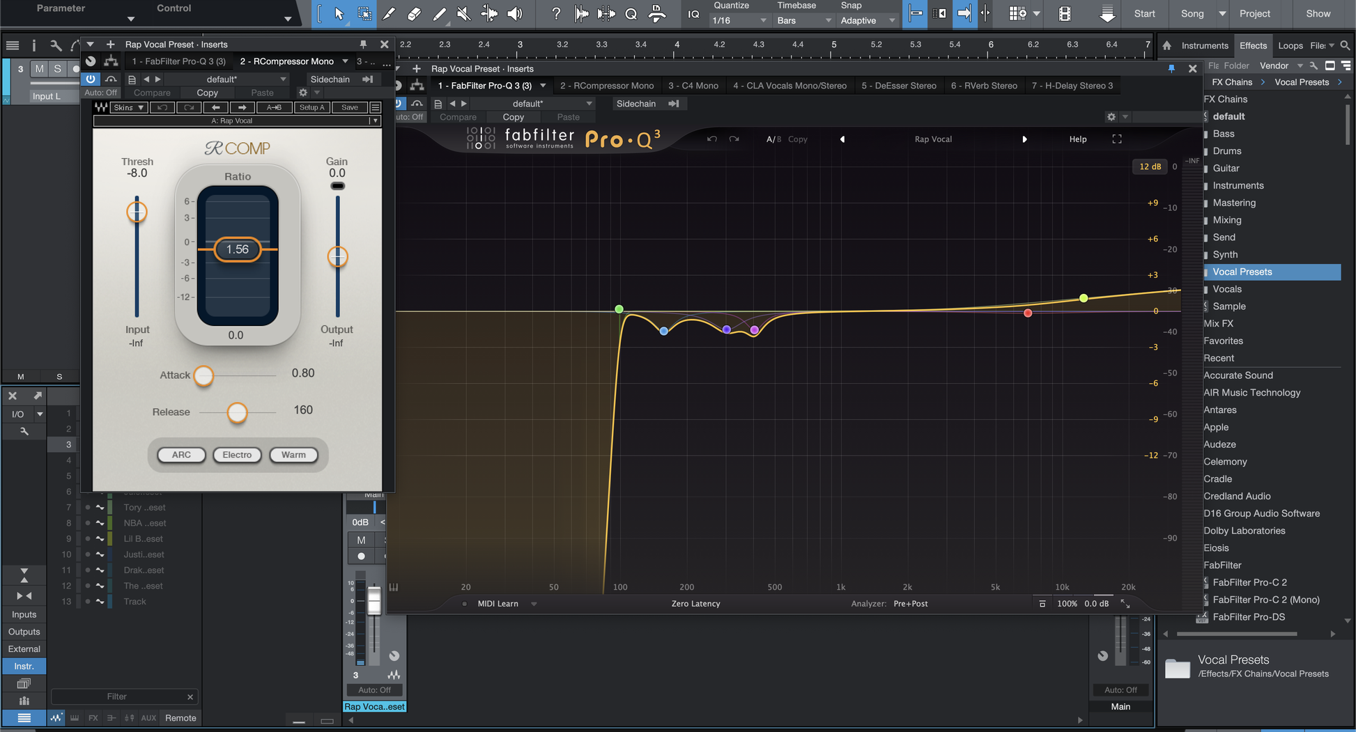 FabFilter Pro-Q3, RCompressor, C4, CLA Vocals, DeEsser, ReVerb, H-Delay