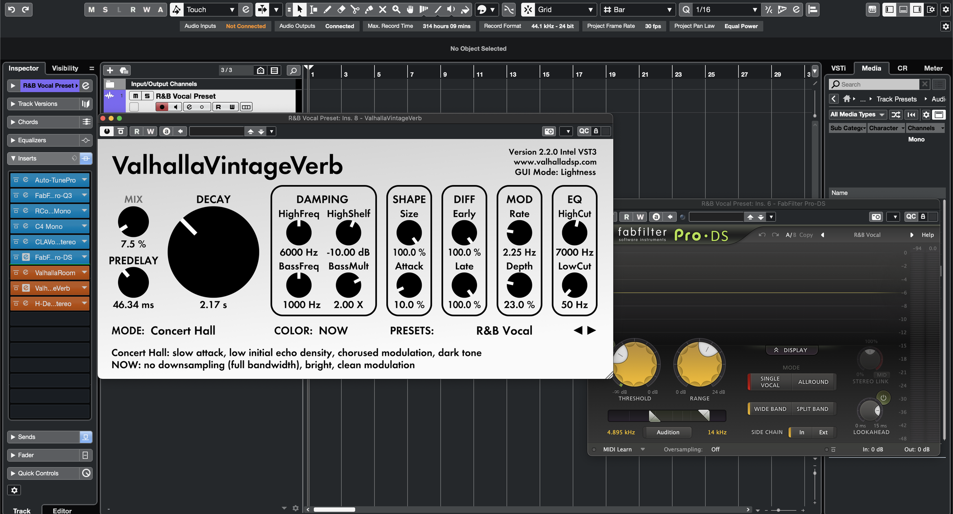 Auto-Tune Pro, C4 Compressor (Waves), CLA Vocals, FabFilter Pro-DS, FabFilter Pro-Q3, RCompressor, ValhallaRoom, Valhalla VintageVerb, H-Delay