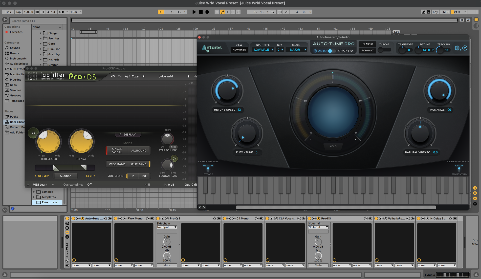 RVOX, FabFilter Pro-Q 3, C4 (Waves), CLA Vocals (Waves), FabFilter Pro-DS, ValhallaRoom, H-Delay