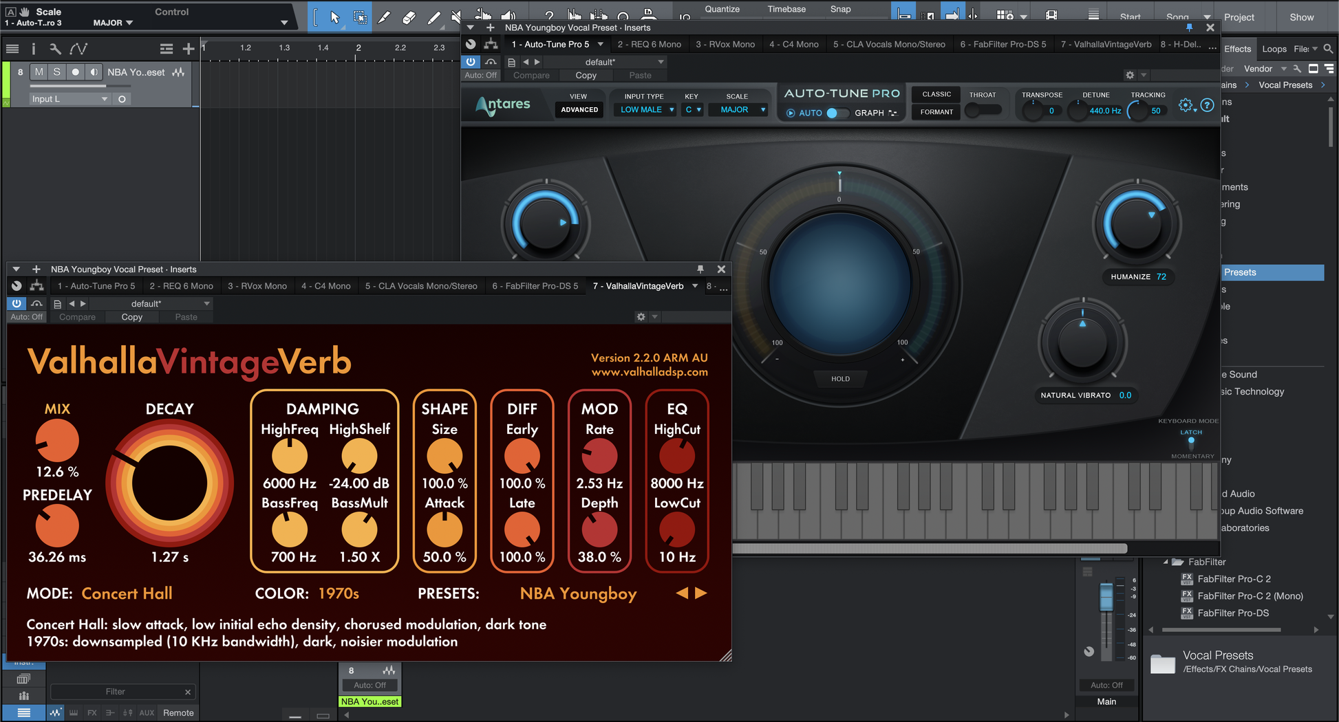 Auto-Tune Pro, REQ, C4 Compressor (Waves), FabFilter Pro-DS, CLA Vocals (Waves), Valhalla VintageVerb, H-Delay