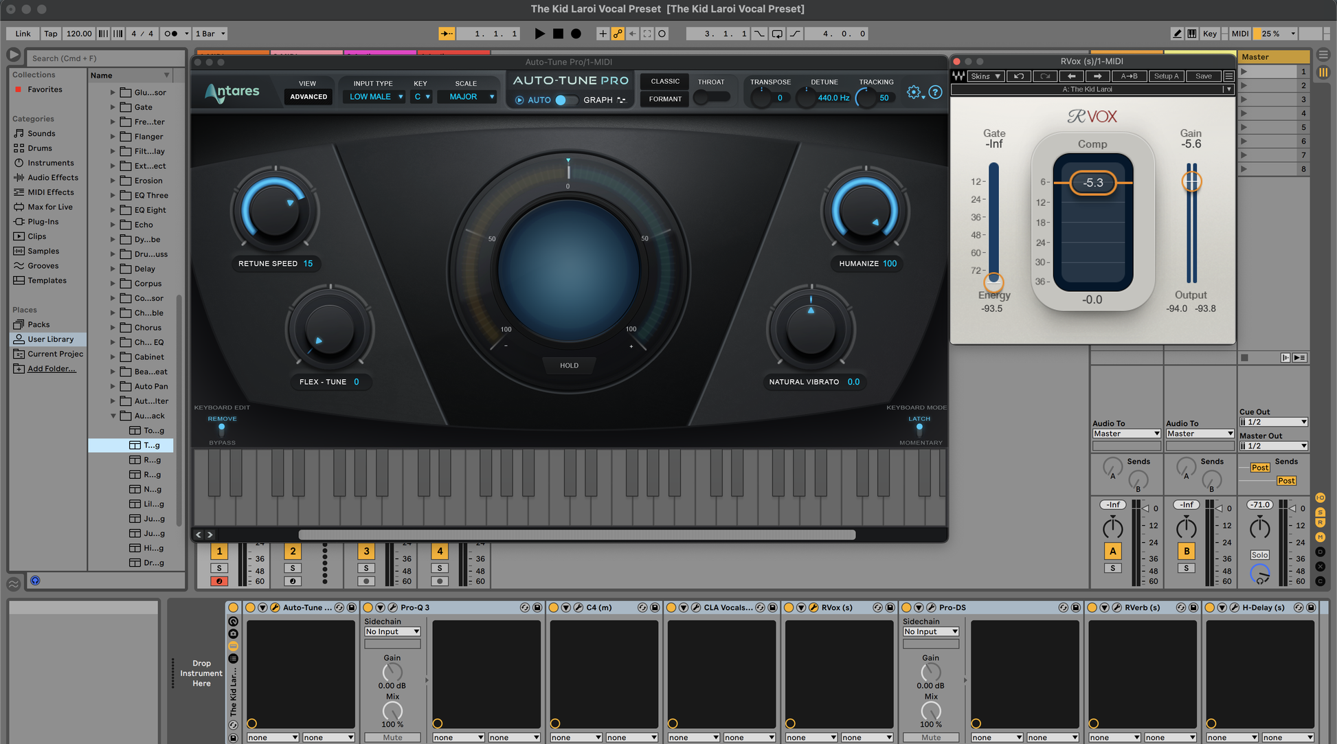 Auto-Tune Pro, C4 Compressor (Waves), CLA Vocals, FabFilter Pro-DS, FabFilter Pro-Q3, H-Delay, RVerb, Rvox Compressor
