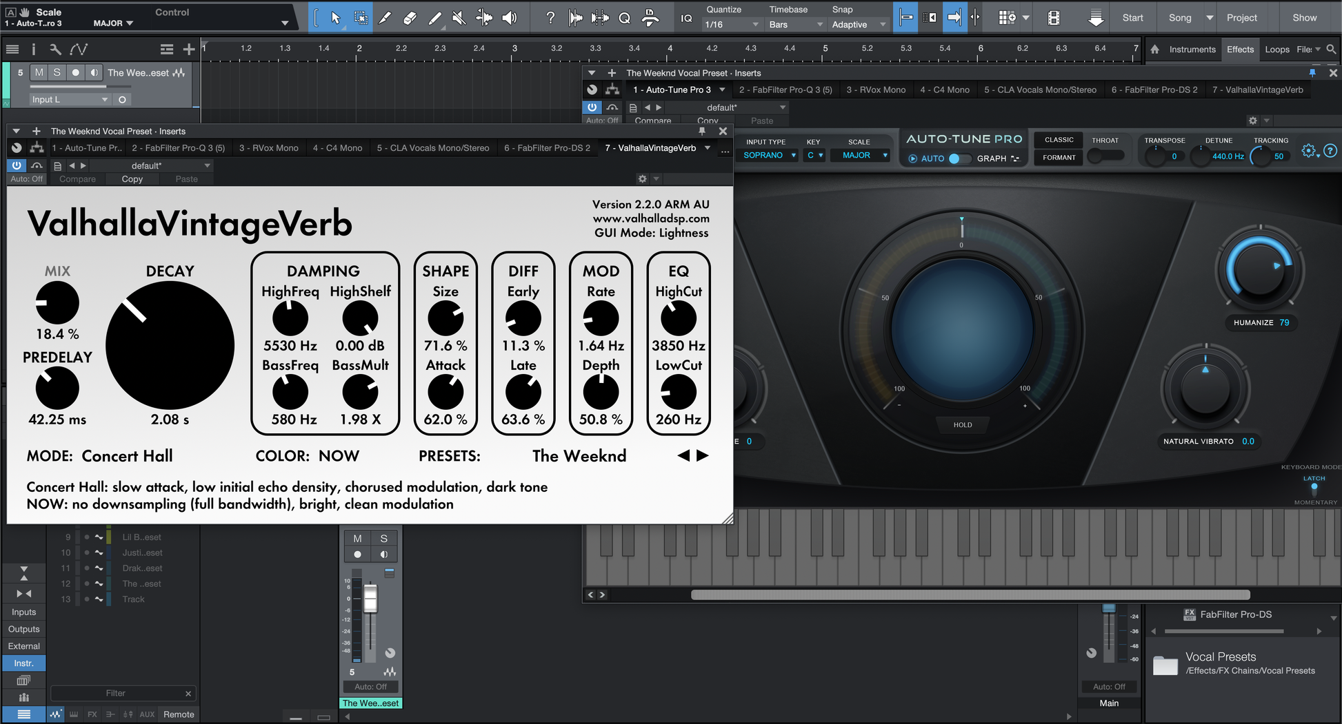 Auto-Tune Pro, C4 Compressor (Waves), CLA Vocals, FabFilter Pro-DS, FabFilter Pro-Q3, RVox, Valhalla VintageVerb