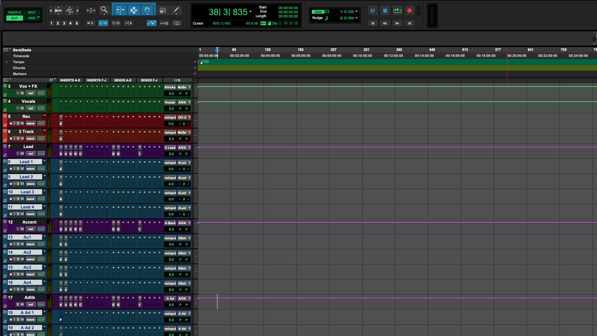 Ścieżki oznaczone kolorami i opisane dla płynnej nawigacji w Pro Tools