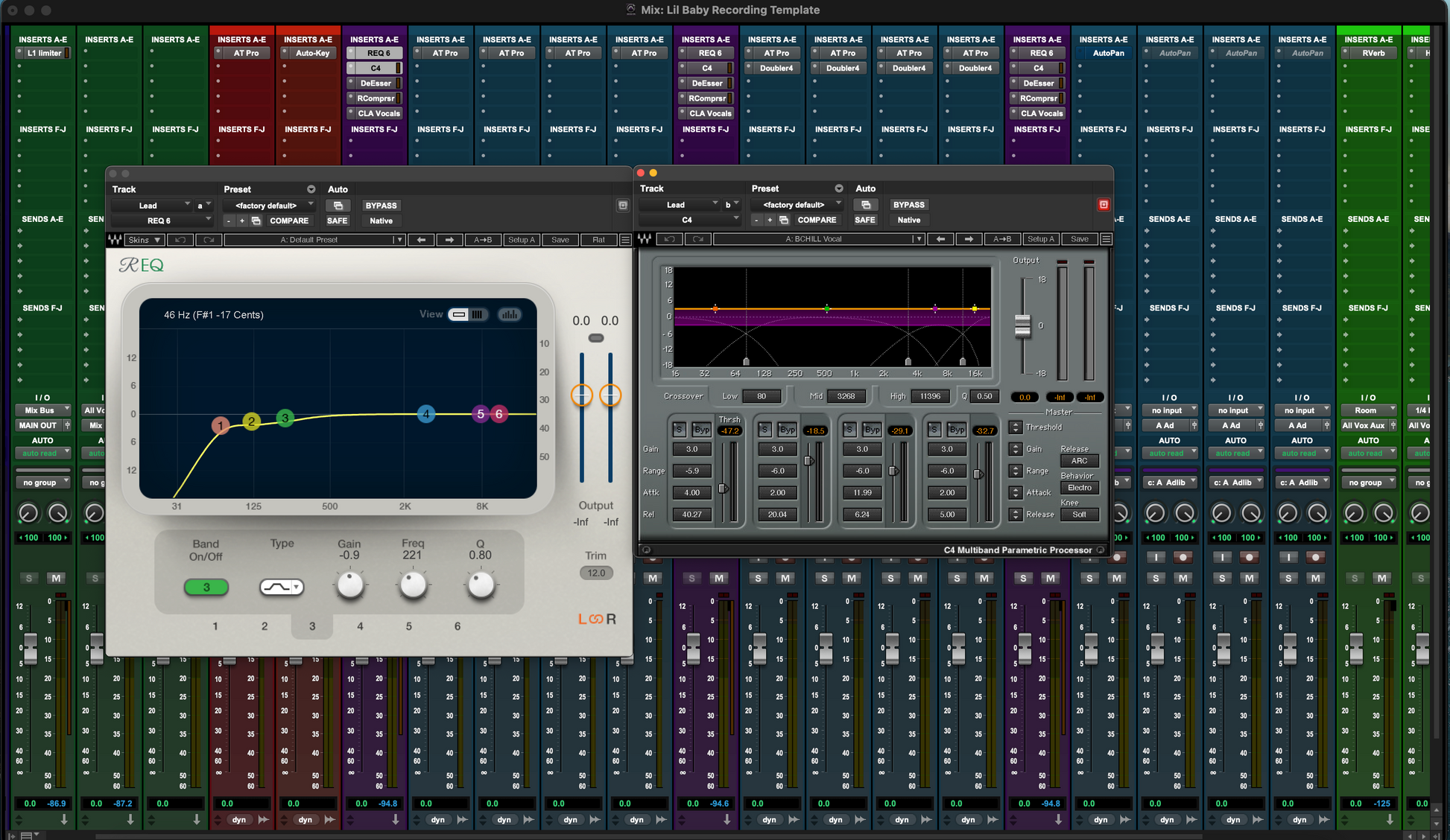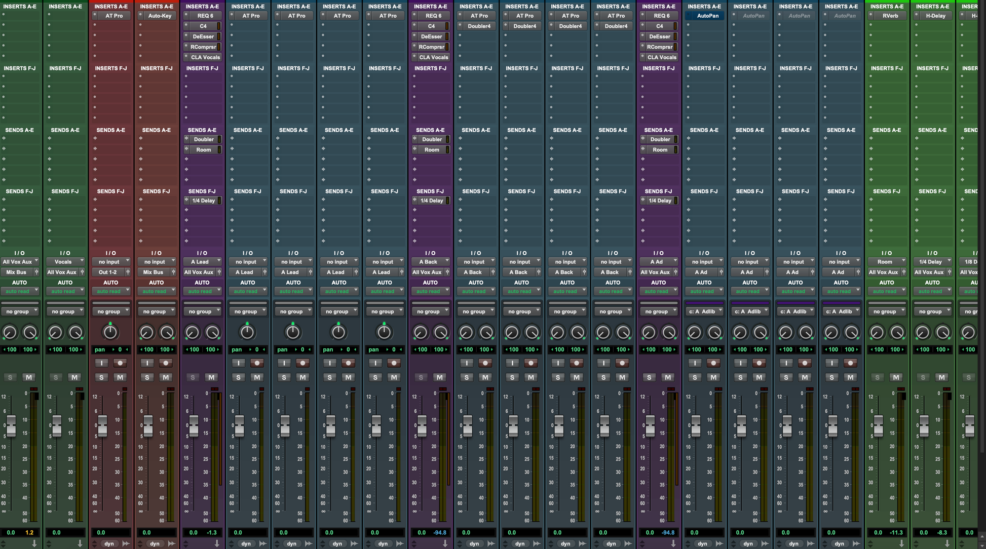Auto-Tune Pro, Auto-Key, AutoPan, Waves C4 Compressor, CLA Vocals, DeEsser, Doubler 4, FabFilter Pro-Q 3, Pro-DS, RCompressor, RVerb, H-Delay