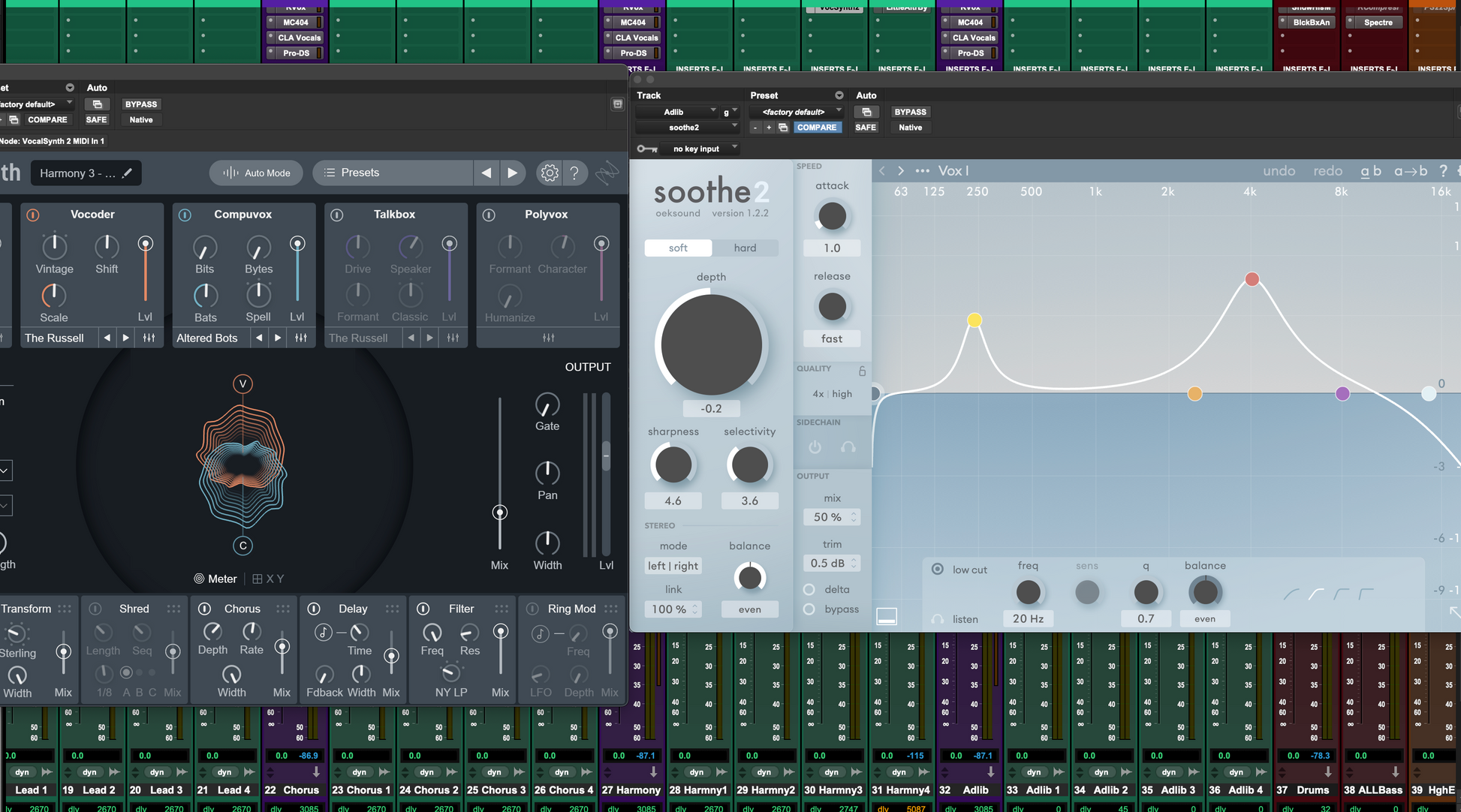 Auto-Tune Pro, Blackbox HG-2, Bx Digital V3, CLA MixDown, CLA Vocals, Doubler 2, FabFilter Pro-Q 3, Pro-L2, Pro-DS, H-Delay, iZotope Ozone 9, J37, Little AlterBoy, MC404, OneKnob Filter, P22 Spread, PanMan, RBass, RVox, Shadow Hills Mastering Compressor, Soothe 2, Spectre, Supertap, Valhalla VintageVerb, VocalSynth 2