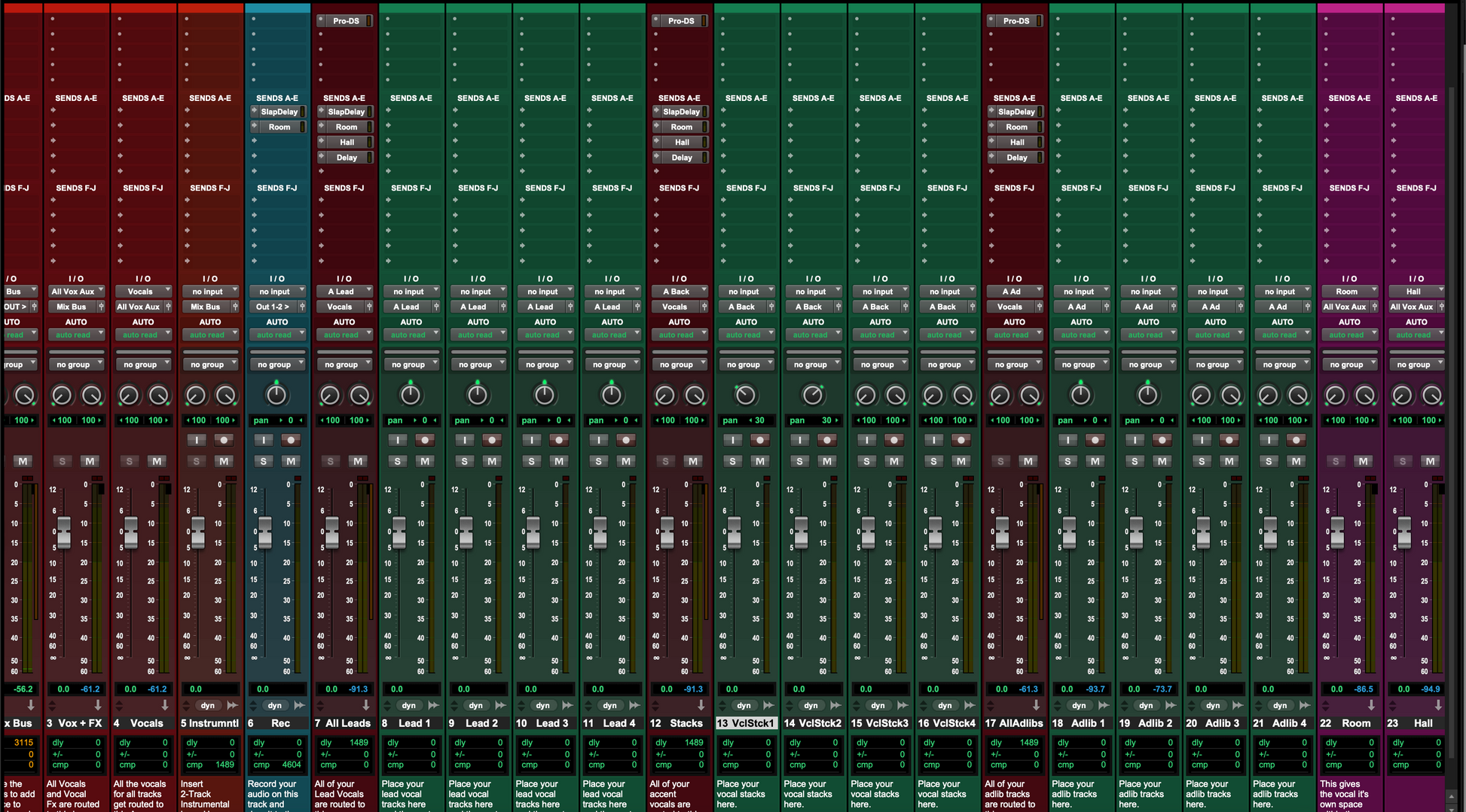Complete vocal chain pre-routed for leads, doubles, adlibs & FX