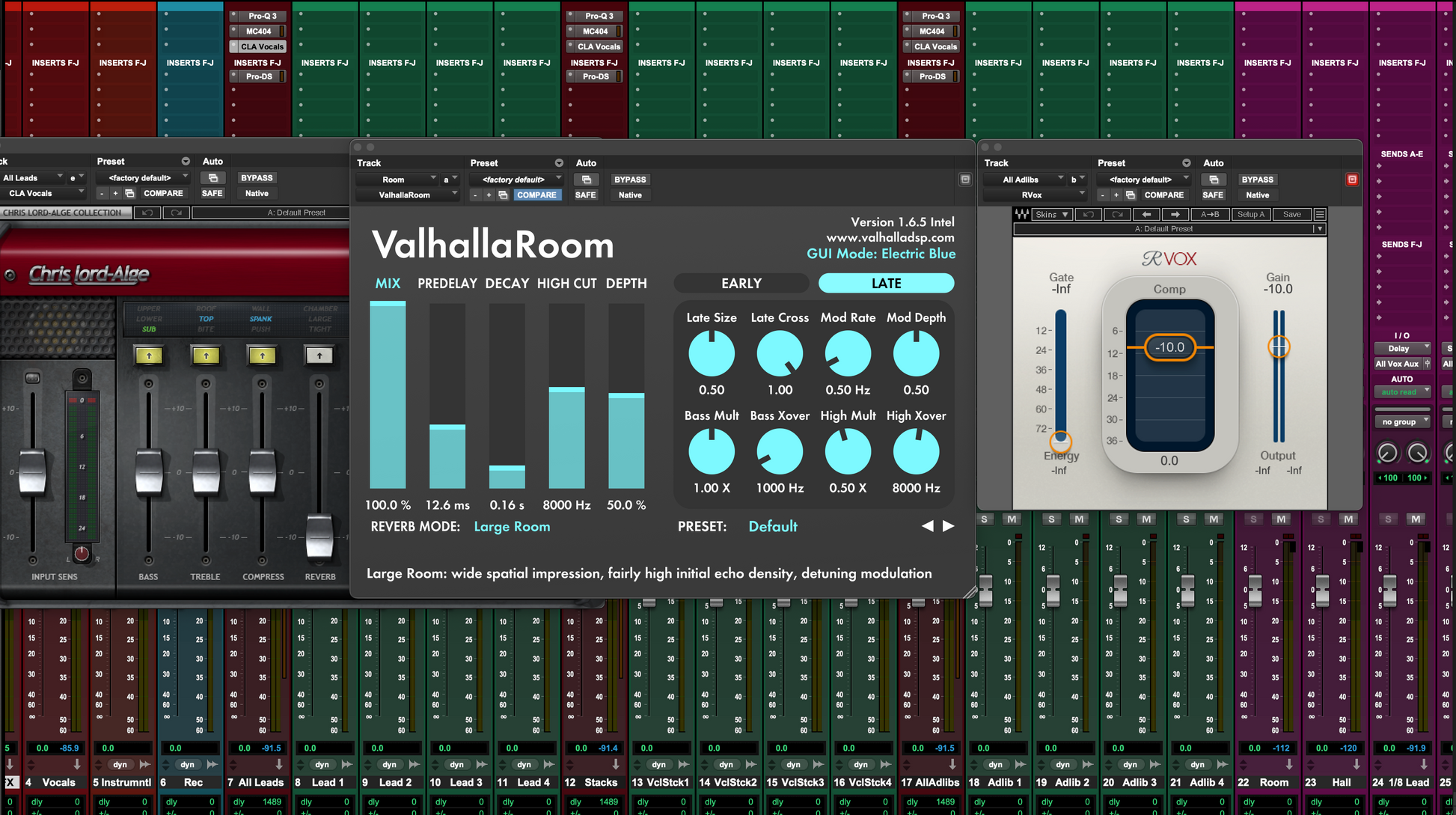 Avid Lo-Fi, AutoPan, C4 Compressor, CLA Vocals, Doubler 4, FabFilter Pro-Q 3, Pro-DS, Pro-L2, H-Delay, MC404, RVox, Valhalla Vintage Verb, Valhalla Room