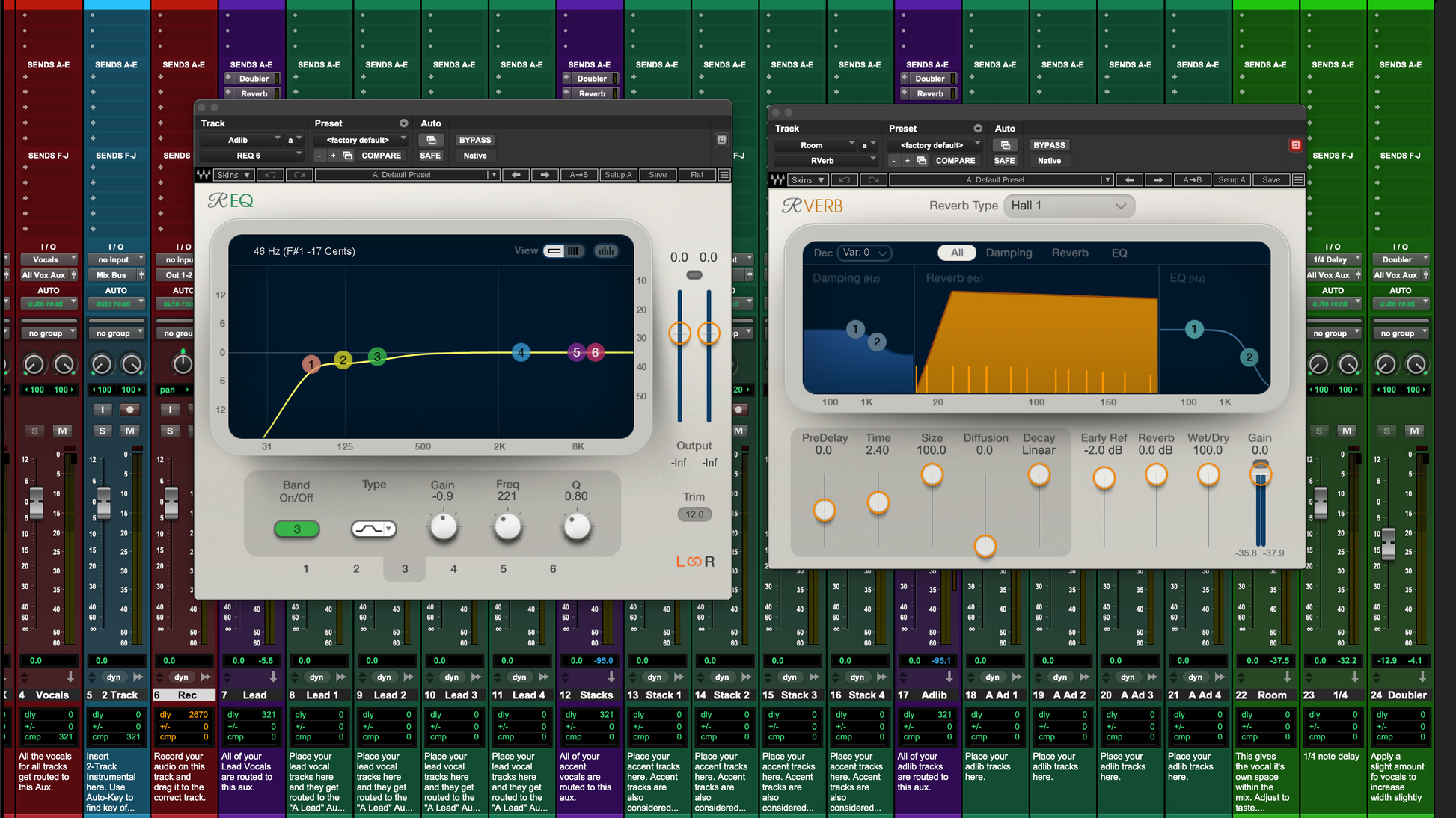 AutoPan, Waves C4, CLA Vocals, Doubler 4, EQ3 7-Band, FabFilter Pro-Q 3, Pro-DS, RCompressor, REQ 6, RVerb, H-Delay, L1 Limiter