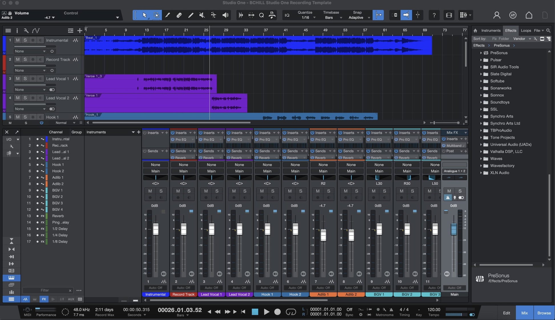 This Studio One Recording Template sets up tracks, gain staging, and sends so you can start recording immediately with native effects.