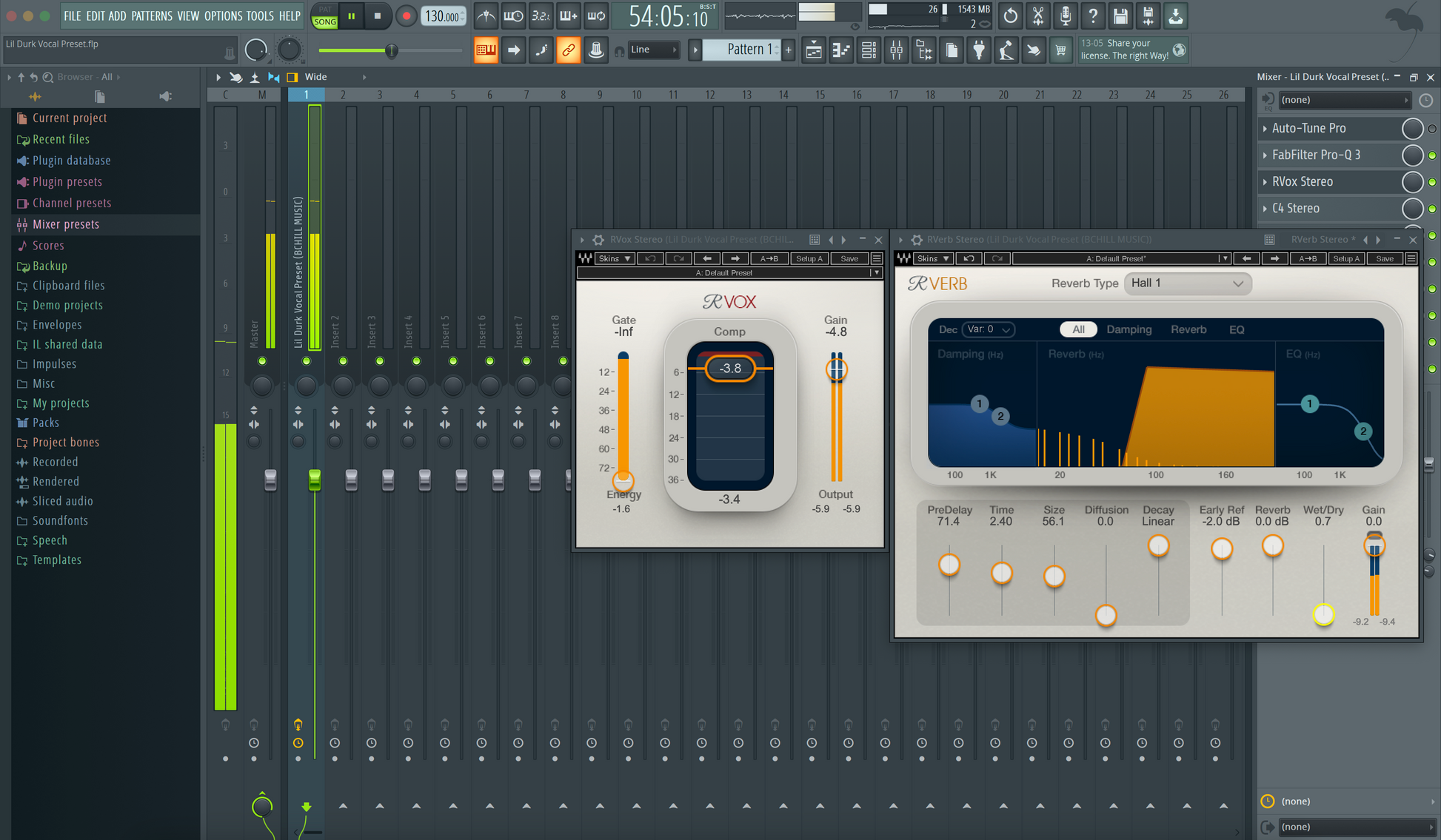 Auto-Tune Pro, C4 Compressor (Waves), CLA Vocals, FabFilter Pro-Q 3, FabFilter Pro-DS, H-Delay, RVox, RVerb