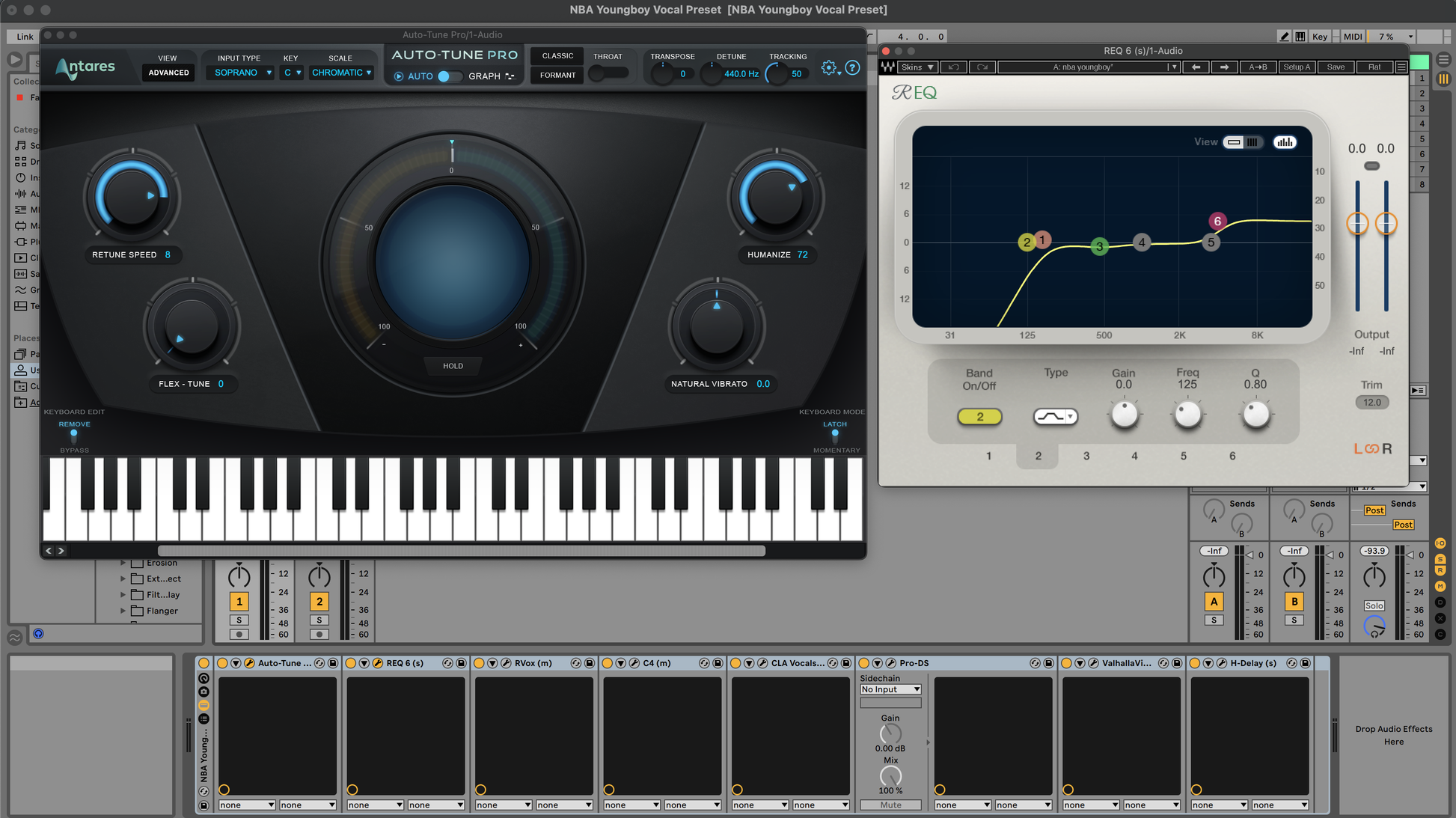 Auto-Tune Pro, REQ, C4 Compressor (Waves), FabFilter Pro-DS, CLA Vocals (Waves), Valhalla VintageVerb, H-Delay