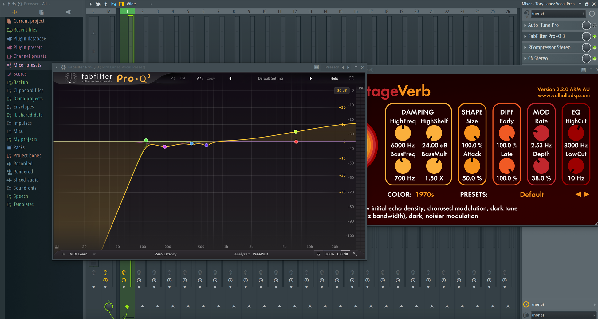 Auto-Tune Pro, C4 Compressor (Waves), CLA Vocals, FabFilter Pro-Q 3, FabFilter Pro-DS, DeEsser, H-Delay, RCompressor, Valhalla VintageVerb